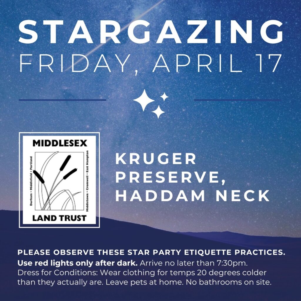 Join the Middlesex Land Trust & Astronomical Society of Greater Hartford for a stargazing event on Friday, April 17. Please arrive no later than 7:30.